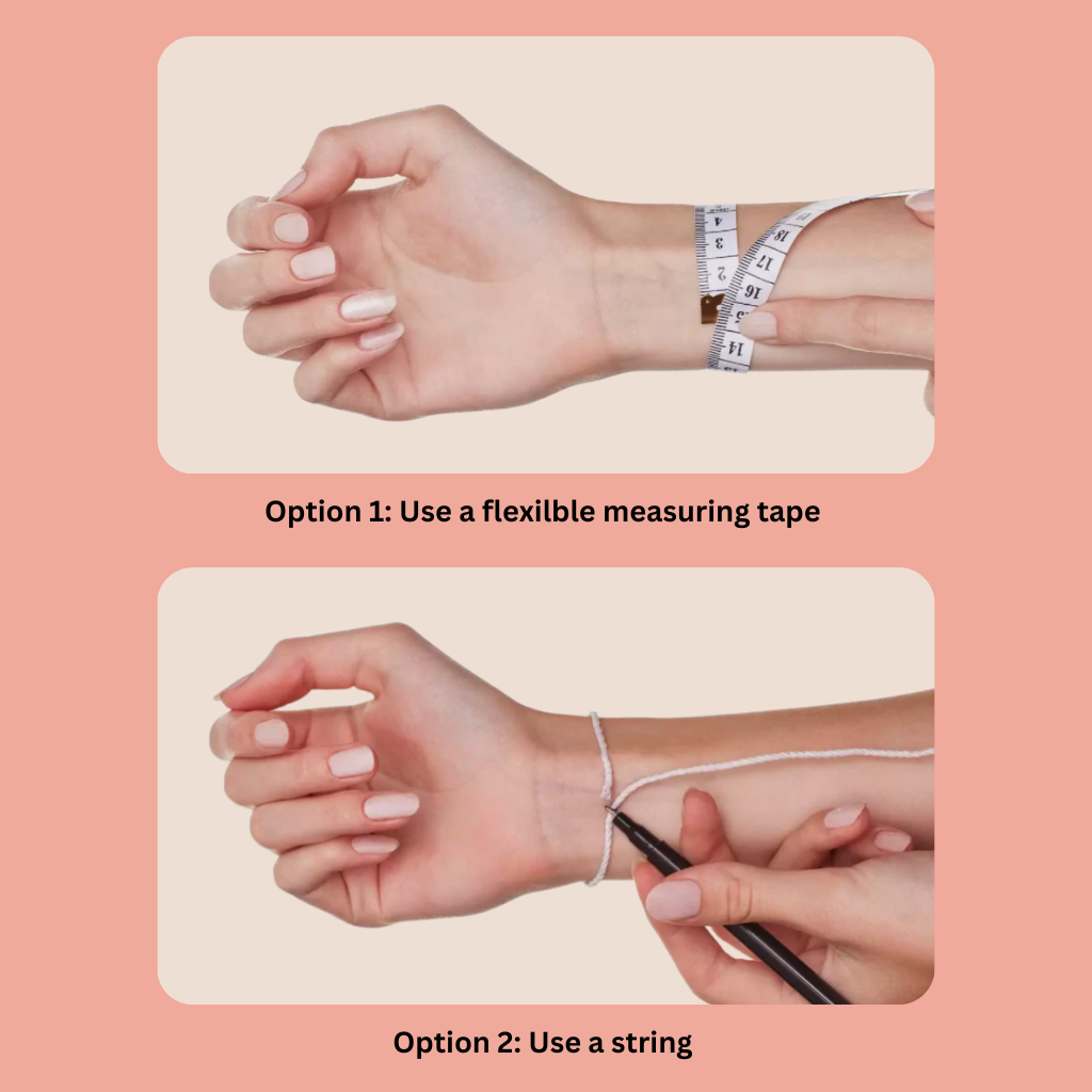 Option 1: To get your wrist size measurement, have your palm open and facing up, wrap the measuring tape around your wrist, just above your wrist bone.